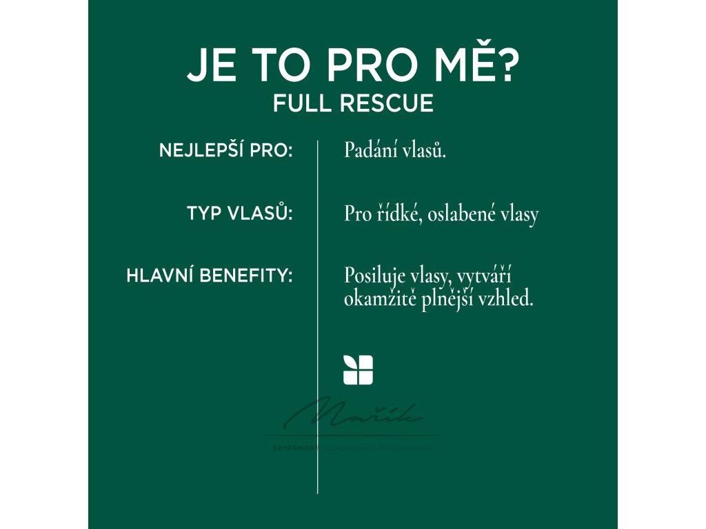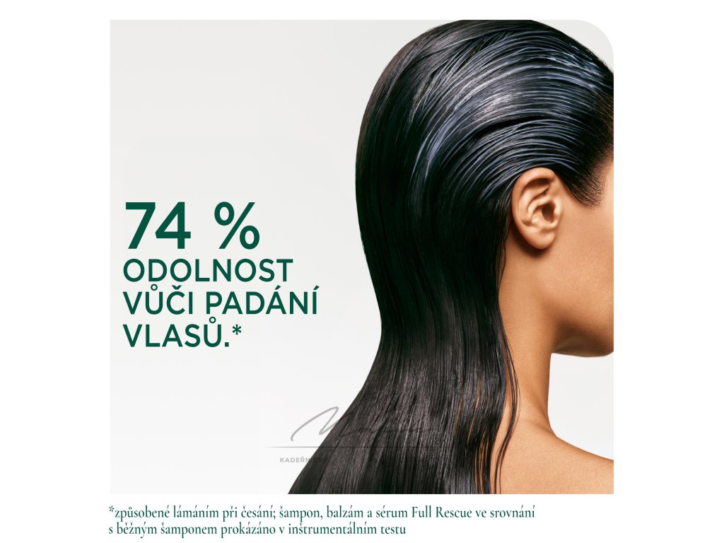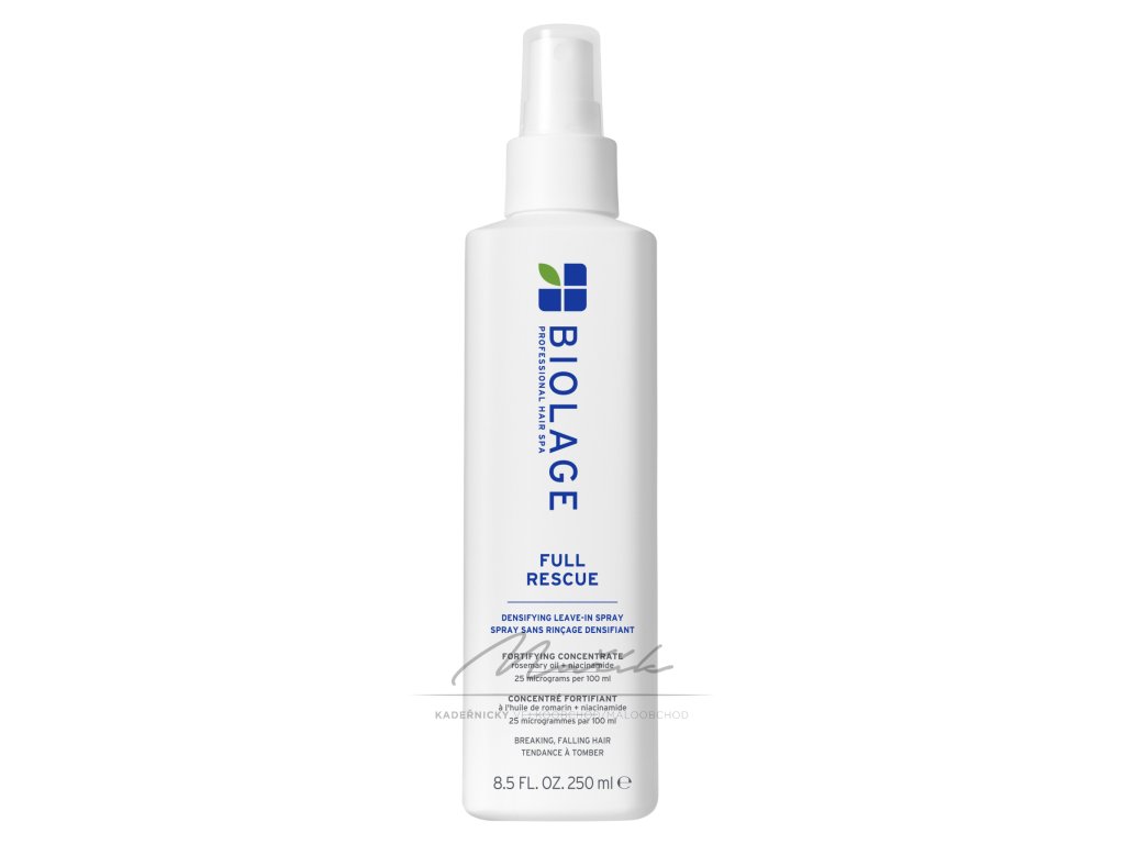 Díky zhušťujícímu bezoplachovému spreji Full Rescue dodáte svým vlasům maximálně plný vzhled. Gelové složení s polymery pomáhá vlasy viditelně i pocitově zhustit od kořínků až ke konečkům. Nezatěžuje vlasy a nevytváří efekt křupavých vlasů. Redukuje výskyt poletujících vlásků a zlepšuje skluz vlasů pro snazší rozčesávání a styling. Zhušťující bezoplachový sprej Full Rescue je obohacený o mikrodávky posilujícího koncentrátu, který obsahuje rozmarýnový olej destilovaný parou a třikrát pročištěný niacinamid. Koncentrát byl odborně kalibrovaný s přesností na mikrogramy, přináší maximální objem, aniž by negativně ovlivnil hebkost a přirozený pohyb vlasů.