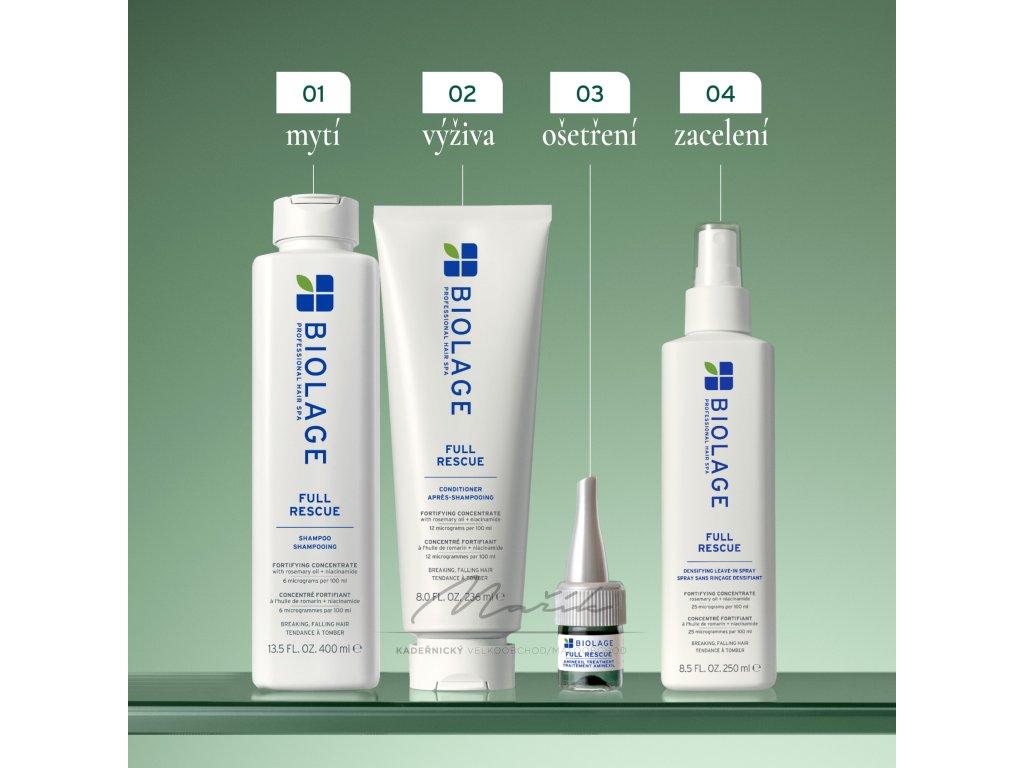 Objevte kompletní rutinu Full Rescue, která sestává z šamponu, balzámu, masky, séra na vlasovou pokožku, aminexilové péče a bezoplachového spreje.